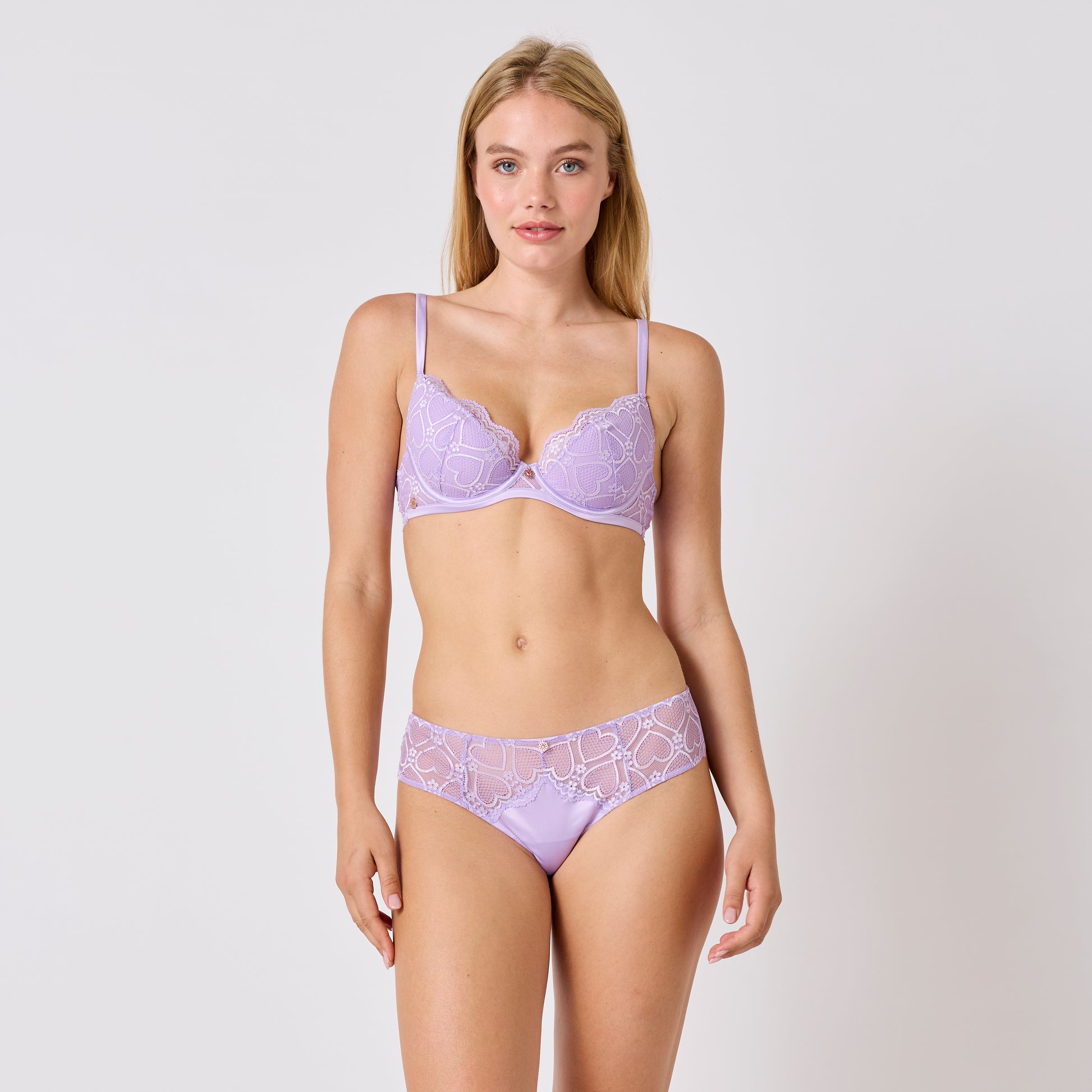 Sa dentelle motif cœurs et ses biais satinés lui confèrent un charme tendre et féminin.